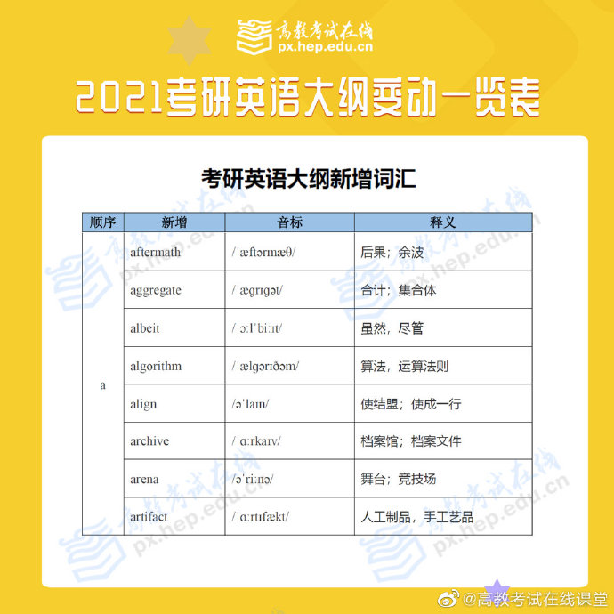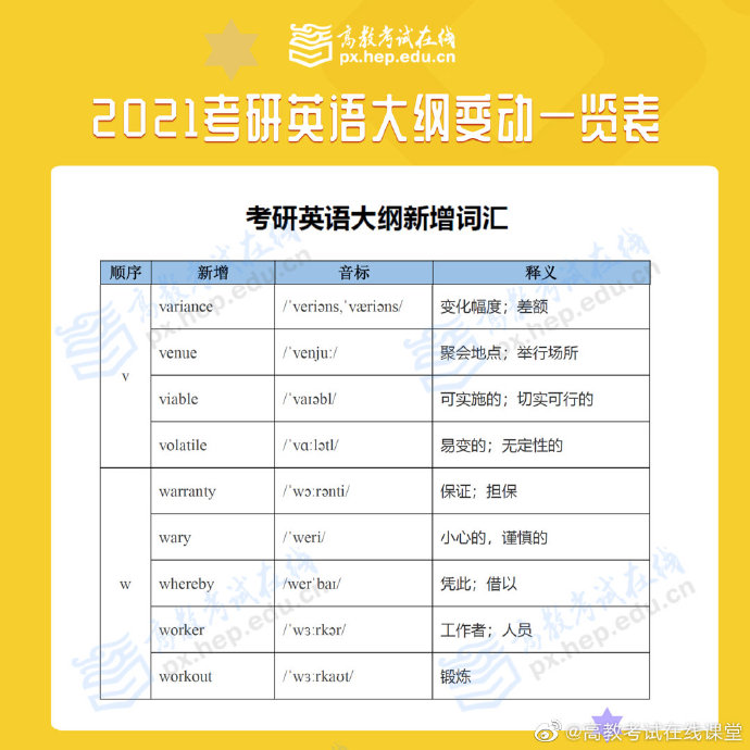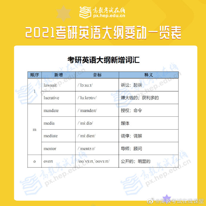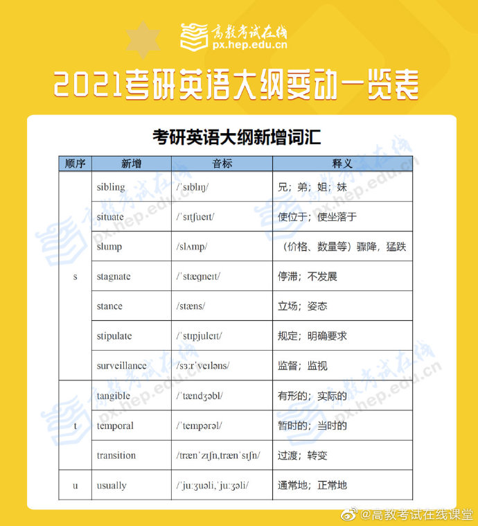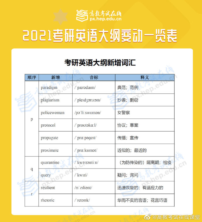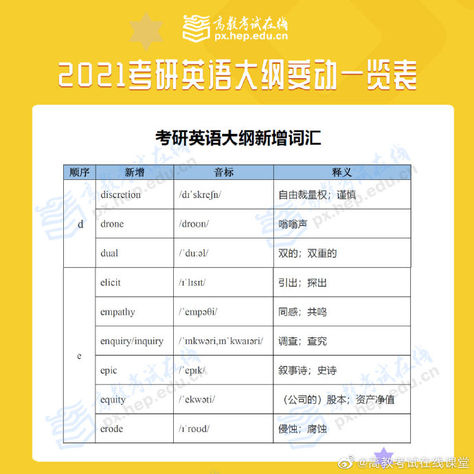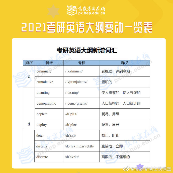 根据高等教育出版社消息,2021全国硕士研究生招生考试大纲在9月9日正式发布上市,9月10日大纲内容公布!考研大纲规定当年全国硕士研究生入学考试相应科目的考试范围、考试要求、考试形式、试卷结构等权威政策指导性考研用书,对考生备考至关重要!点击预约2021考研新大纲解析峰会,带你深度解析新大纲变化,开启高效复习之路!2021考研英语大纲已出,一起来看看到底哪里有变动吧
