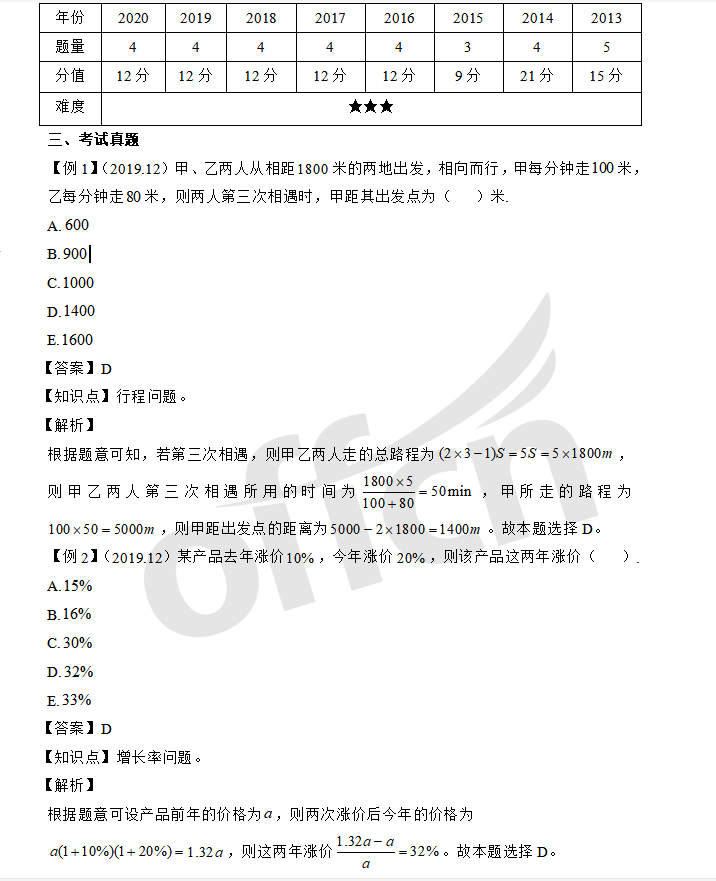 应用题这一部分是每年必考的模块,主要考察的是学生的数学抽象、数学建模、数据运算和数据分析等综合能力,并且应用题模块占的分值也比较多,根据中公初数研究院统计每年出题分值占比约17.9%左右。