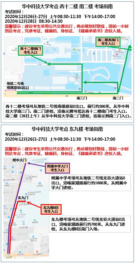 (1)西十二楼:校外报考我校、考试科目为4门的考生(考生编号后六位为:100001-103050、108001-108032、109001-109033),可从华中科技大学南二门、南三门进校;从西十二楼南门入场。