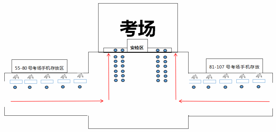 考试当天考生需要将携带的手机等设备放在考点封闭区外的手机存放处,然后再通过智能安检门进行安检,安检合格后方能进入考汤。为保证考试当天考生有序完成考前进场安全检查工作,请各位考生在查看考场之前配合现场工作人员完成安全检查演练。手机存放处在考试楼栋两侧。