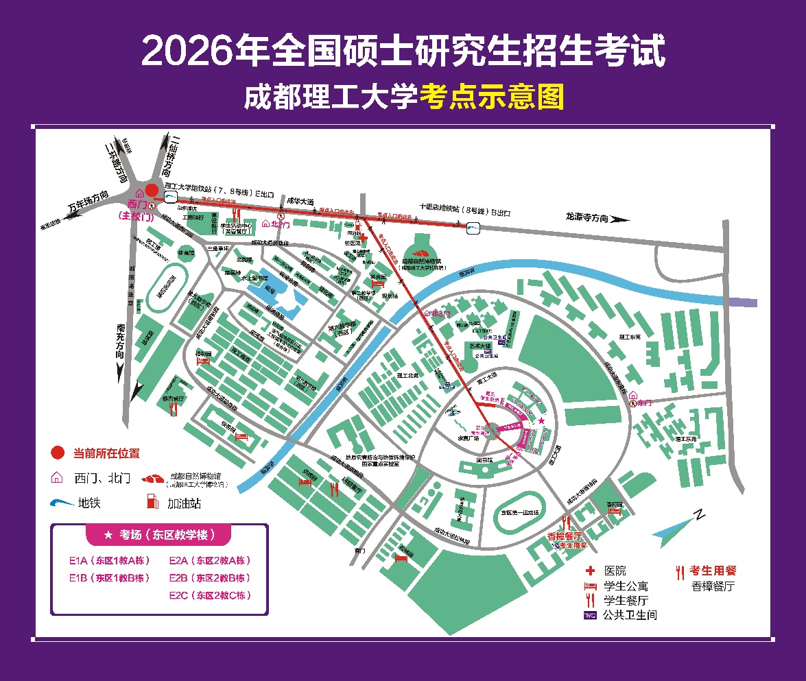 我校考点详细地址:成都市二仙桥东三路1号。为方便考生到达考场,学校将专门开放二仙桥东三路1号北3门(理工加油站和成都自然博物馆之间)。考点示意图中的红色标注路线为成都理工大学西门到考场(东区教学楼)路线,考生可步行约15分钟左右到达考区,请考生留够充足时间,以免影响考试。