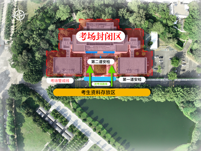 沿着E座教学楼前校道旁设置“考生资料存放区”,用于考生存放手机和随身物品,如下图黄色区域: