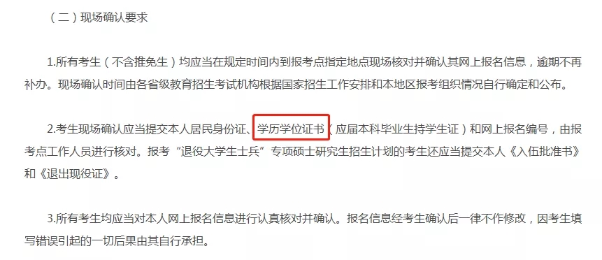 相较去年的通知中,今年在证书要求上添加了“学位”二字,请广大考生们多多注意!还没有获得学位证的应届本科毕业生持学生证即可,较以往没有变动。除此之外,具体现场确认环节还请关注目标学院或招生单位的官网通知,如有变动,还请大家以官网为准。