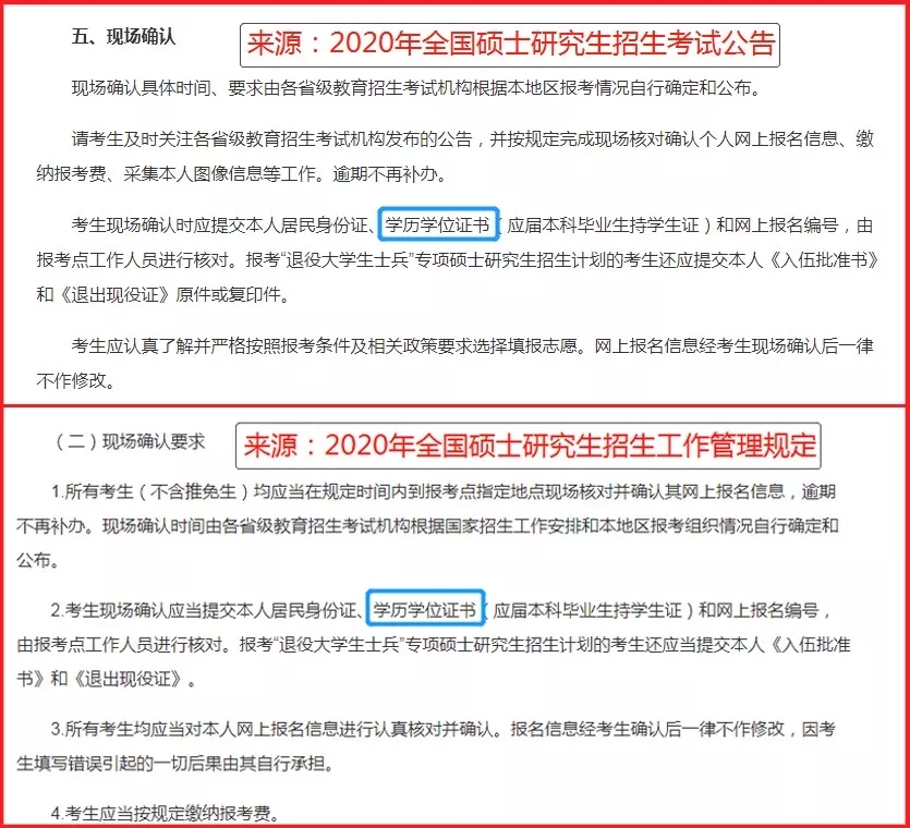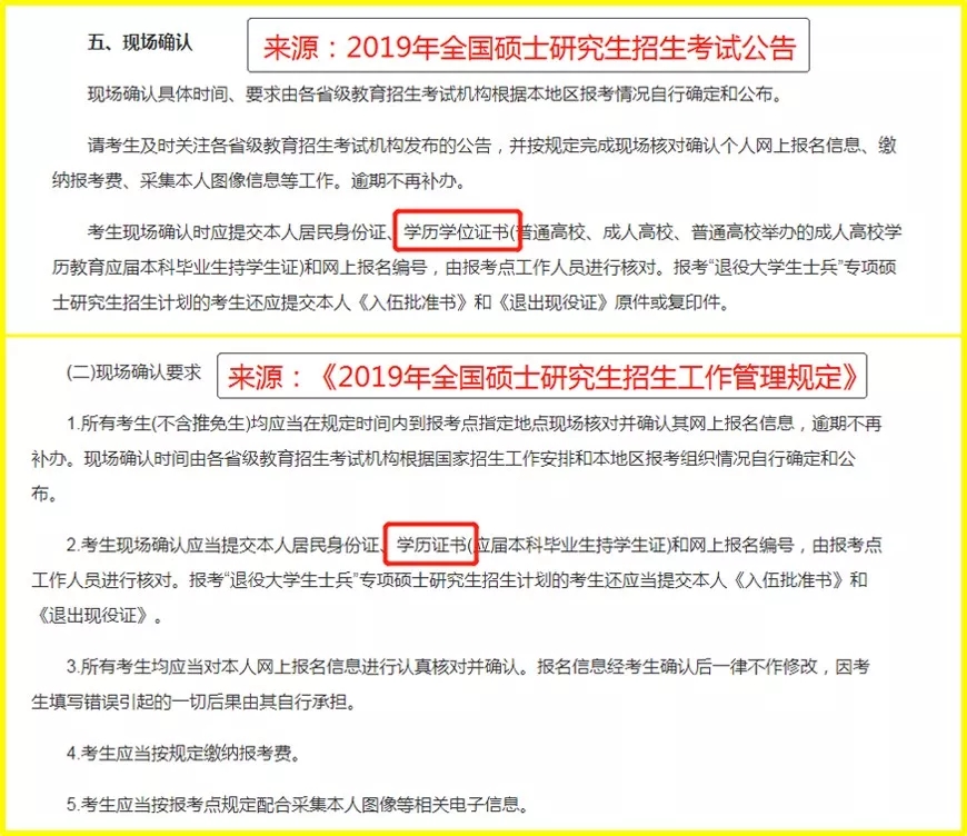而《2019年国硕士研究生招生工作管理规定》则显示现场确认仅需提供学历证书,去年现场确认实际也无需提供学位证书。