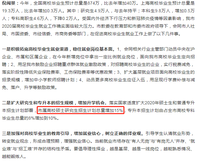 近日,上海市发布扩招通知,也有非中西部地区和东北地区的高校做出扩招回应,可见,扩招,不只是中西部地区和东北地区。