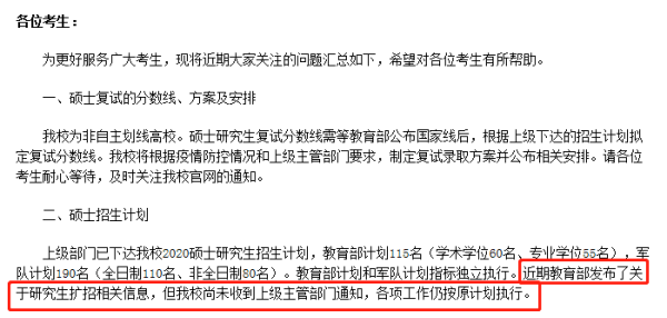 空军军医大学:近期教育部发布了关于研究生扩招相关信息,但我校尚未收到上级主管部门通知,各项工作仍按原计划执行。