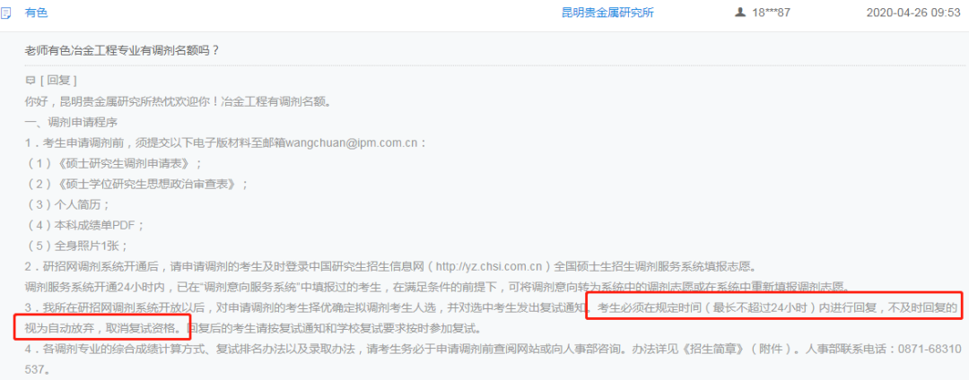 这里对调剂的同学提了要求,如果没有在24小时之内回复,则视为放弃复试!