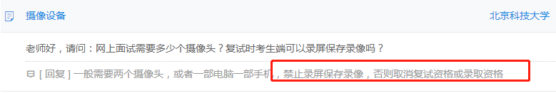 复试是国家研究生招生考试的一部分,复试内容属于国家机密级。复试过程中禁止录音、录像和录屏,禁止将相关信息泄露或公布;复试全程只允许考生一人在面试房间,禁止他人进出。若有违反,视同作弊。
