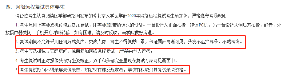 复试过程中本人全程出镜,不得中途离开座位,房间内不得有其他人,也不允许出现其他声音。复试期间不允许采用任何方式变声、更改人像。考生不得佩戴口罩,保证面部清晰可见,头发不遮挡耳朵,不戴耳饰。考生应选择独立安静房间,独自参加网络远程复试,严禁由他人替考。