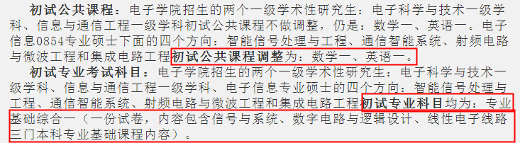 [0854]电子信息专硕下面的四个方向:[085401]智能信号处理与工程、[085402]通信智能系统、[085403]射频电路与微波工程、[085404]集成电路工程,初试公共课程由数学二、英语二调整为数学一、英语一。报考此专业的同学要及时调整公共课复习。