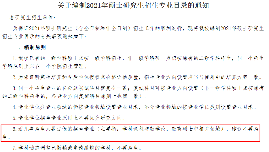 曲阜师范大学关于编制2021年硕士研究生招生目录的通知中第6点:近几年招生人数过低的招生专业(主要指:学科课程与教学论、教育硕士中相关领域),建议不再招生。