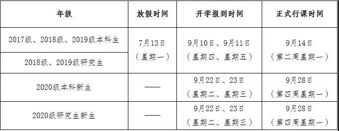 在校学生7月13日至9月4日放假,9月5日、6日(星期六、星期日)返校报到注册,9月7日(星期一)正式行课,如因疫情影响,返校时间及相关安排另行通知。
