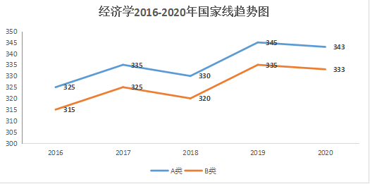 2018年以前经济学分数线相对平稳,A区分数线基本稳定在325-335之间,2018年数学题目较难,导致分数线相对较低,仅为330分。2019年数学较易,当年国家线没有出来前,很多人预计分数线涨幅在5-10分左右,但结果出乎所有人意料,当年经济学分数线忽然暴涨15分。那些2019年考到330-335分的同学特别吃亏,这个分数在前一年稳过A区线,结果同样的分数,却在2019年连B区分数线都过不了,调剂也是彻底无门。