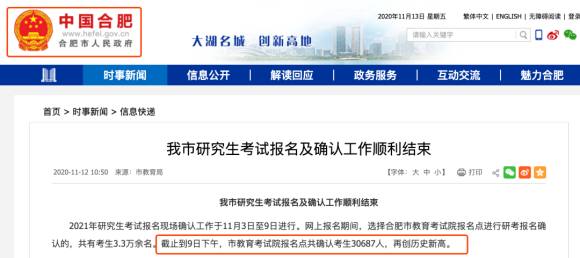 2021年研究生考试报名现场确认工作于11月3日至9日进行。网上报名期间,选择合肥市教育考试院报名点进行研考报名确认的,共有考生3.3万余名。截止到9日下午,市教育考试院报名点共确认考生30687人,再创历史新高。