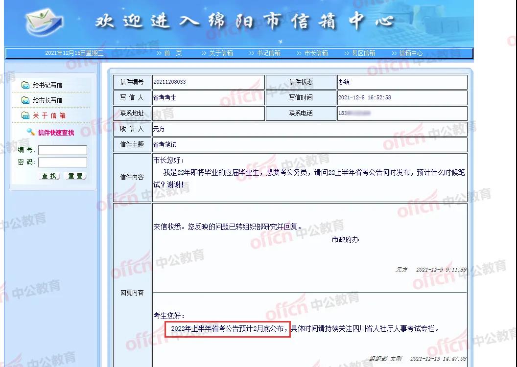此前,绵阳,凉山市长信箱相继传出消息!官方回复:明年上半年四川省考预计2月底发布公告!