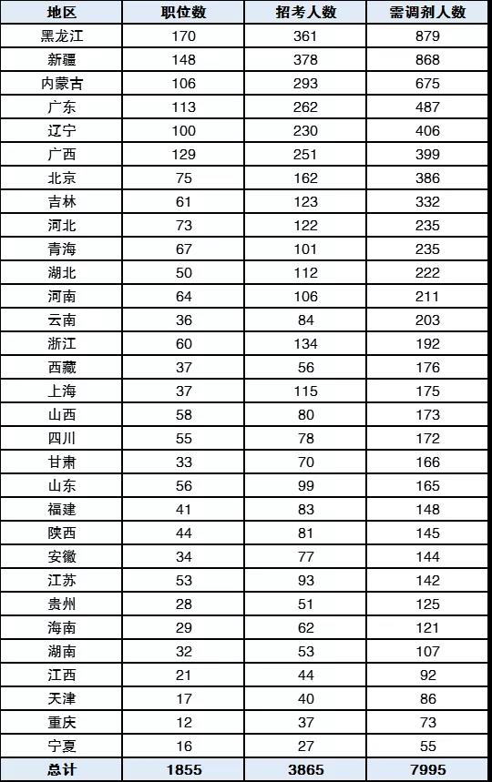2022国考调剂需求遍布全国各地,31个省(市、区)均有调剂计划,其中黑龙江、新疆和内蒙古位居前三甲,与去年情形相似。黑龙江和新疆需求量较大,均在800人之上,领先于其他地区,此外首都北京还有386人需要调剂,主要集中在中央机关,报考中央层级机关且达到分数线的考生认真筛选一下职位,还有可能重拾希望。