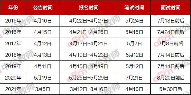 小师就2015年至2021年全省统考(含国编及特岗)的报名、笔试时间进行汇总,分析如下: