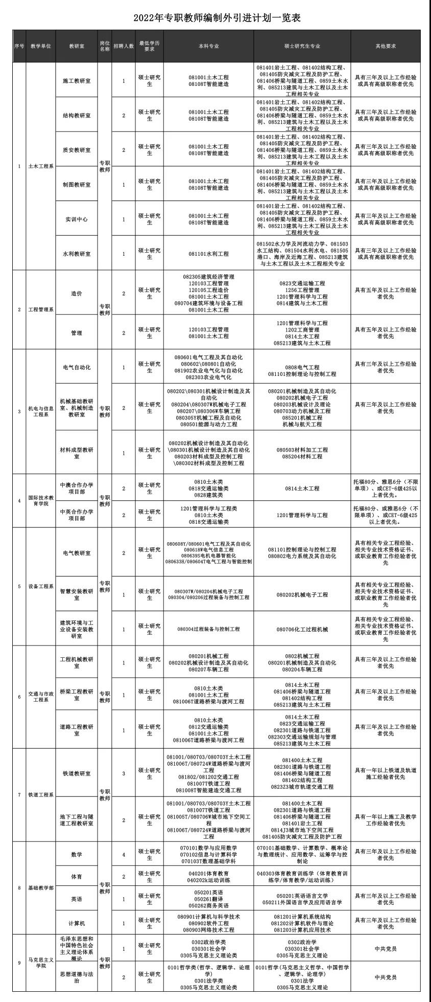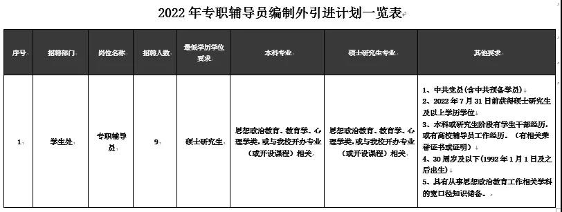具体岗位及要求详见《2022年专职教师编制外引进计划一览表》和《2022年专职辅导员编制外引进计划一览表》。