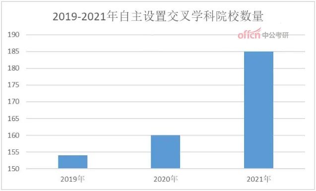 2020年我国自主设置交叉学科的院校数量为160个,相较于2019年的院校数量增加6个。2021年比2020年再度增加25个,自主设置交叉学科的院校数量达到185个。