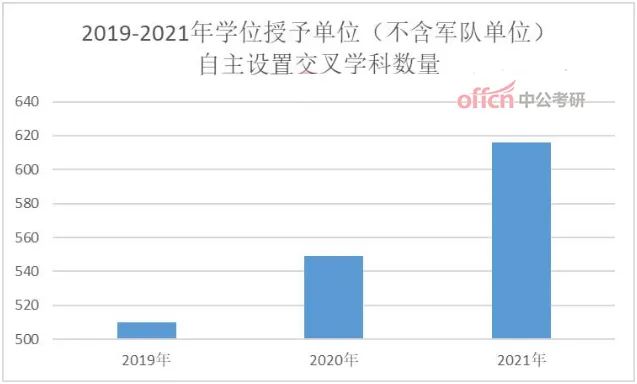2020年我国学位授予单位(不含军队单位)自主设置交叉学科数量为549个,较2019年同比增长7.6%,2021年学位授予单位(不含军队单位)自主设置交叉学科数量为616个,较2020年增幅达到12.2%。