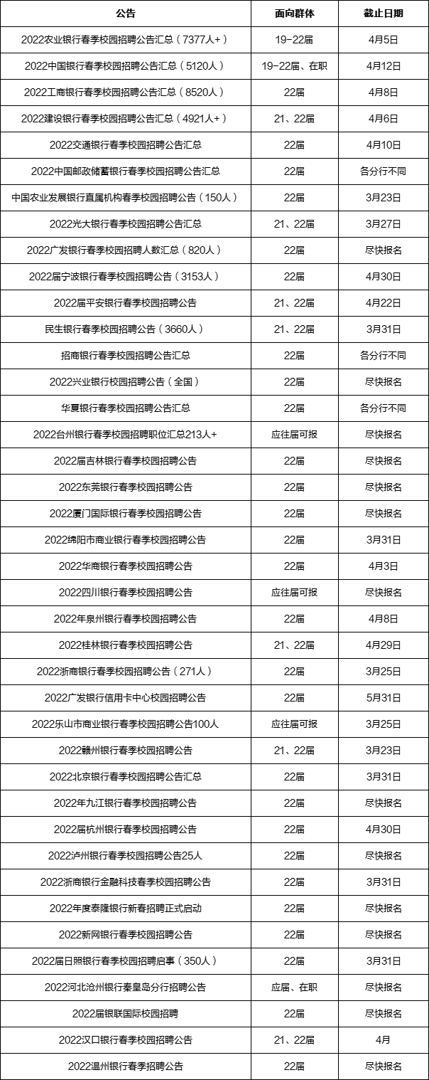 2022各大银行春季招聘已陆续启动!以下招聘汇总统统给你参考,银行春季招聘34000+人