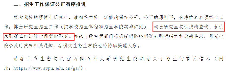 进入2月份各院校研究生招生工作将会陆续开展,但由于受2020年新型冠状病毒肺炎疫情影响,部分院校对于研究生初试成绩查询、复试录取等工作进程时间有所变化调整。根据西南石油大学研究生院官方通知,硕士研究生初试成绩查询、复试录取等工作进程时间暂时不变。请各位报考西南石油大学的考生及时关注院校官方网站通知,中公考研小编也会及时关注院校动态信息,希望给各位2020考研考生提供帮助~