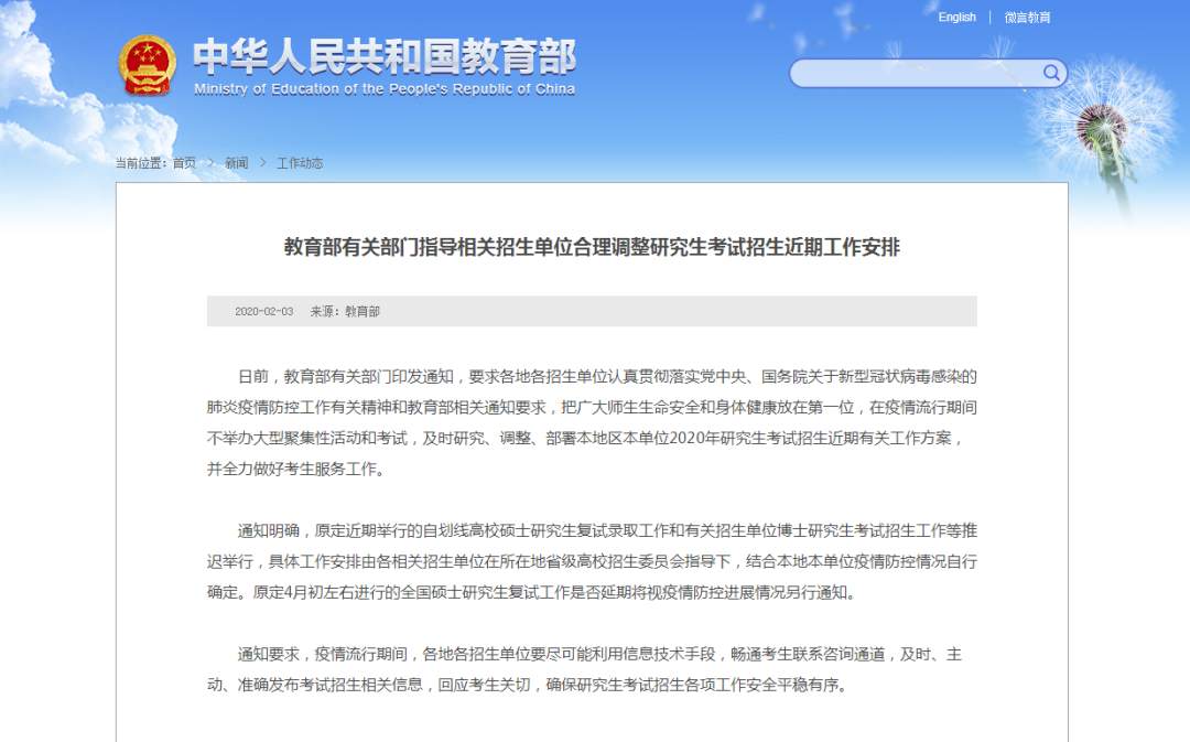 日前,教育部有关部门印发通知,要求各地各招生单位认真贯彻落实党中央、国务院关于新型冠状病毒感染的肺炎疫情防控工作有关精神和教育部相关通知要求,把广大师生生命安全和身体健康放在第一位,在疫情流行期间不举办大型聚集性活动和考试,及时研究、调整、部署本地区本单位2020年研究生考试招生近期有关工作方案,并全力做好考生服务工作。