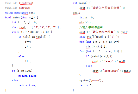 算法思想:这道题是要在字符串中找四个字母EASY,可设计一个辅助的字符串,存储这四个字母,设计两个指针i,j,指针i指向给定的字符串,指针j指向辅助的字符串,当配时,指针i,j均向后移动一位,则