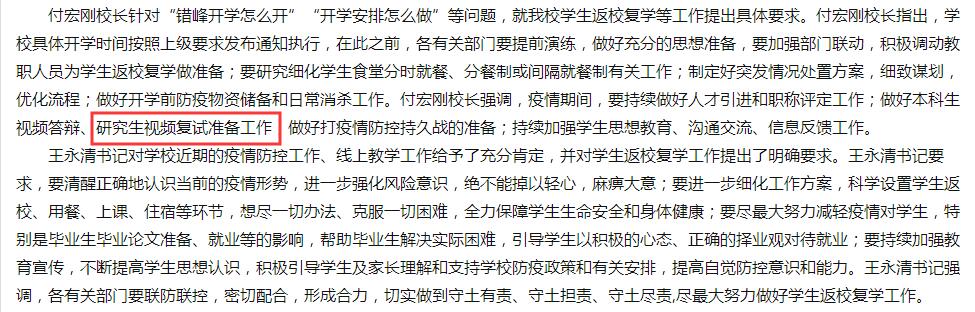 根据黑龙江大学发布《我校开展新学期复学演练》通知强调,疫情期间,要持续做好人才引进和职称评定工作;做好本科生视频答辩、研究生视频复试准备工作;做好打疫情防控持久战的准备;持续加强学生思想教育、沟通交流、信息反馈工作。
