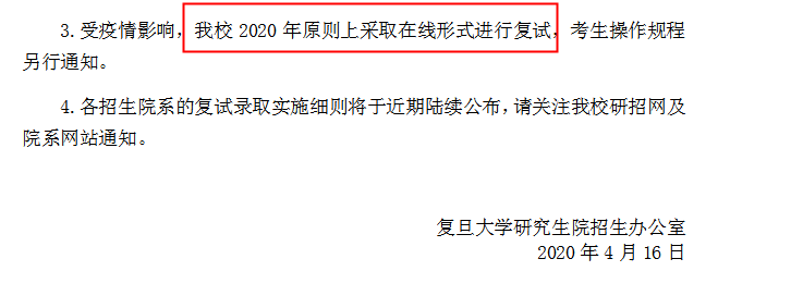 2.我校严格执行 2020 年全国硕士研究生招生考试的初试总分加分政策。按教育部规定可享受初试总分加分政策的考生,须在 2020 年 4 月 27 日前向我校研究生院招生办公室提交书面证明材料。 3.受疫情影响,我校 2020 年原则上采取在线形式进行复试,考生操作规程另行通知。 4.各招生院系的复试录取实施细则将于近期陆续公布,请关注我校研招网及院系网站通知。