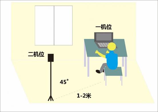 【二机位】:设备摄像头从考生侧后方45度、1-2米处拍摄,需全程清晰显示考生和主机位屏幕。复试过程中设备麦克风和扬声器保持静音,仅开启摄像头功能。复试前手持二机位设备,环绕360度向复试小组展示复试环境。复试中如有必要,考生需根据考官指令随时变换机位位置。