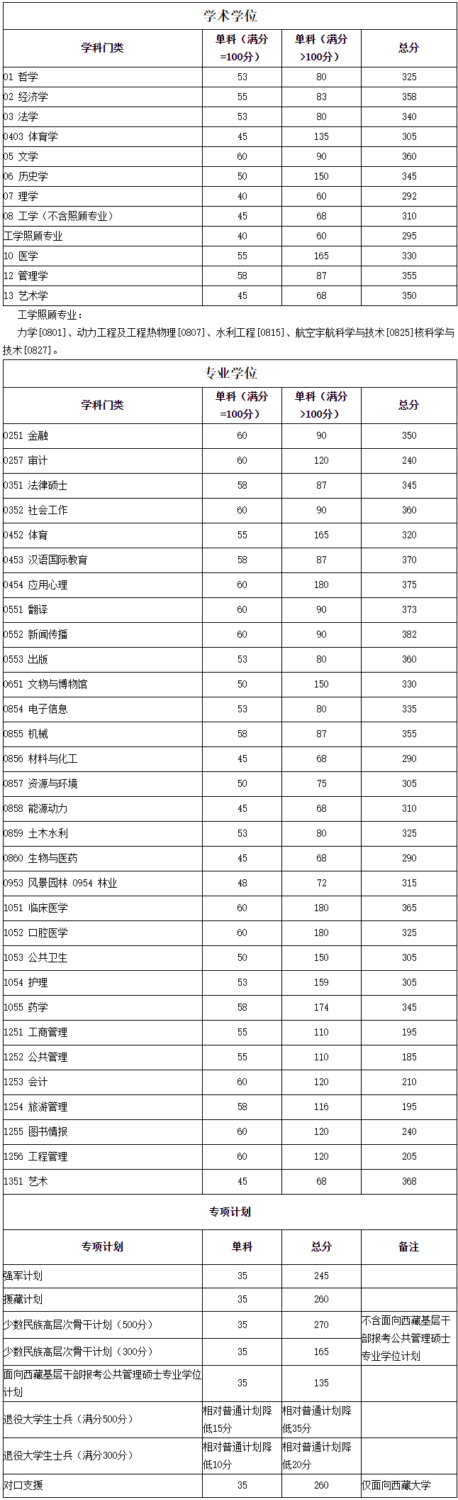| *:学校确定的进入复试的初试成绩基本要求为考生进入我校复试的最低要求,我校各学院(系/所)可根据招生计划、生源情况等因素提高各单位进入复试的初试成绩基本要求。考生能否进入复试以各学院(系/所)公布的进入复试的初试成绩基本要求为准。 |