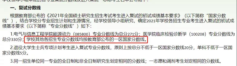 电气与信息工程学院能源动力(085800)专业分数线为总分271分;医学院临床检验诊断学(100208)专业分数线为总分330分;学校其他各招生专业分数线均按教育部公布的一区国家分数线