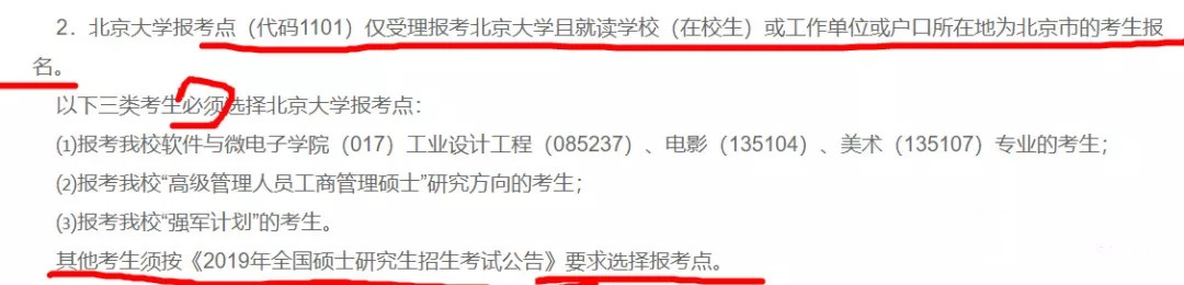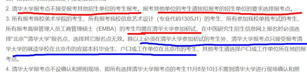 举个栗子:北京大学部分职业要求必须在北大考试,其他考生按《2019考试公告》选择报考点;清华大学部分职业要求必须在清华考试,除以上必须在清华大学参加初试的考生外,清华大学报考点只接受报考清华大学的就读学校在北京市的应届本科毕业生、户口或工作单位在北京市的考生,其他考生请选择户口或工作单位所在地的报考点。