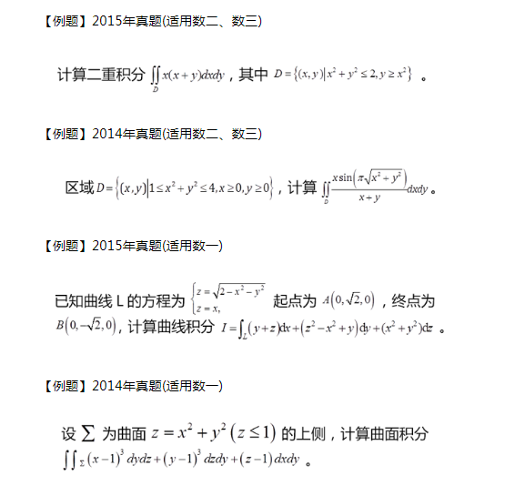 解读:在一元函数积分学中,定积分是某种确定形式的和的极限,这种和的极限的概念推广到定义在区域、曲线及曲面上多元函数的情形,便得到重积分、曲线积分及曲面积分的概念。备考这一部分重点掌握各类多元函数积分的计算。对于数学二、三的考生而言,每年的命题热点在二重积分的计算。对于数学一的考生而言,除重积分(包括二重及三重积分)的计算外,还需注意曲线面积分的计算,三个公式:格林公式、好斯公式及斯托克斯公式的应用。