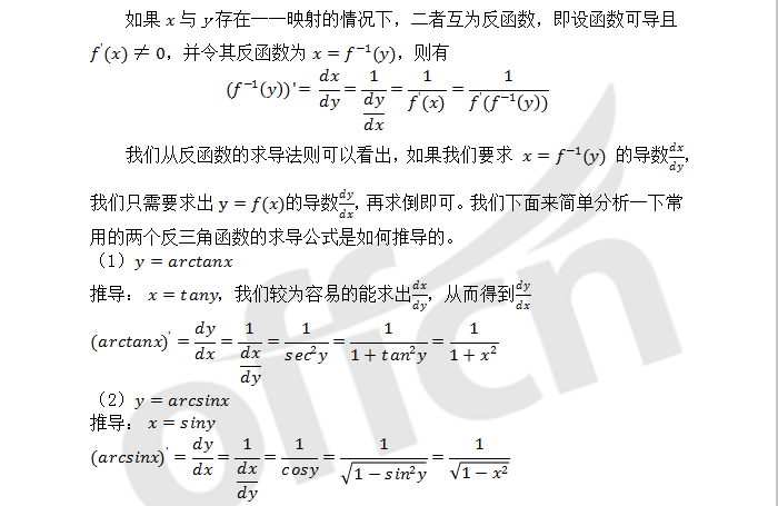 以上是四川中公考研小编为您整理的“20考研数学:浅析反函数求导法则及其应用",预祝每位考生取得好成绩,更多考研常识相关内容尽在四川中公考研数学栏目,中公考研为广大学子推出乐学面授课、VIP一对一等系列备考课程,针对每一个科目要点进行深入的指导分析,欢迎各位考生了解咨询。同时,中公考研一直为大家推出考研直播课堂,足不出户就可以边听课边学习,为大家的考研梦想助力!