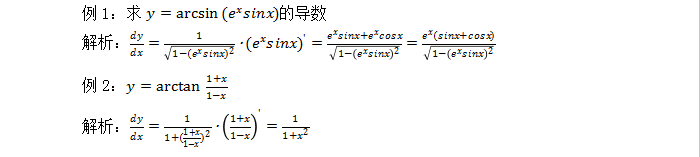 同理,我们还可以推导出其他的反三角函数的求导公式,那我们知道了这些反三角函数的求导公式有什么作用呢?当然有作用,我们可以利用之前所讲的广义化的思想将这些基本的反三角函数求导公式推广到复合反三角函数的求导中,下面我们来举两个例子加以说明。