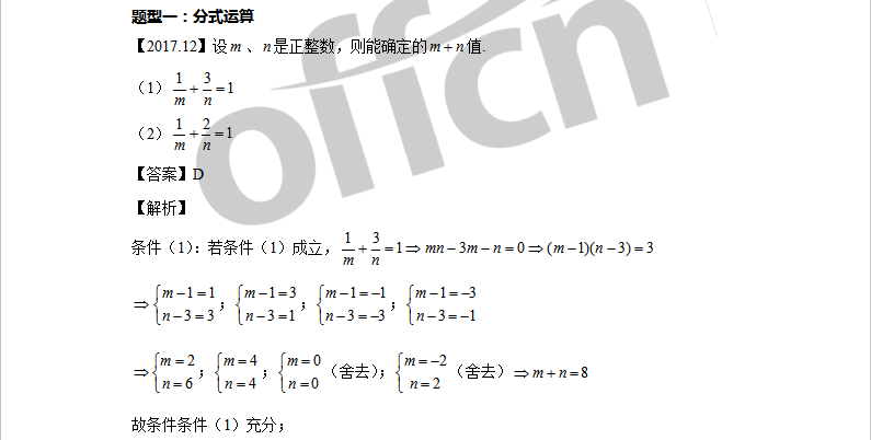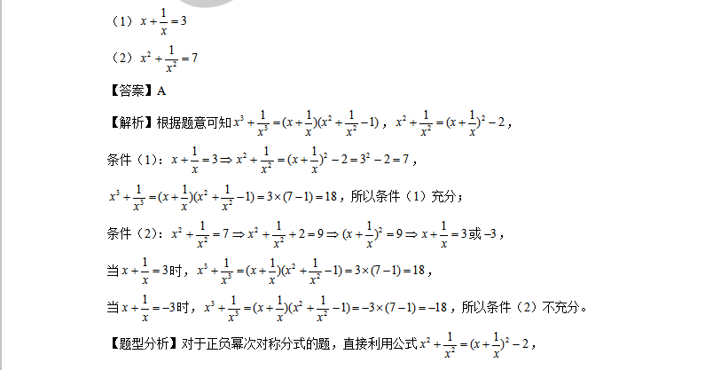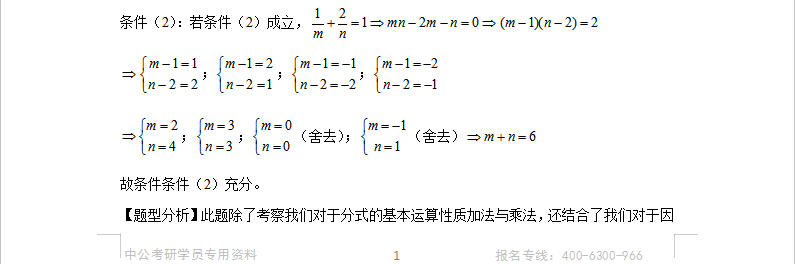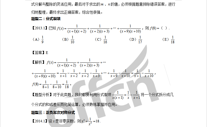 分式属于代数式中的一部分内容,这两年的管理类联考真题中均有涉及,是我们历年考试当中的一个热点,重中之重。大家对于这部分题型的复习,基本运算性质(加、减、乘、除)及方法一定要掌握,观察这两年的真题,我们会发现,对于分式的内容,往往结合我们初数的其他部分知识点如因式分解等进行综合性考察,所以需要大家在日常练习中,一定要提升自己的综合能力,拓展自己的解题思路。