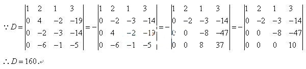 解:首先把第1行分别乘-7、-5、-3,分别加到第2、3、4行上,再交换第2、3行的位置;把第2行分别乘2、-3后,分别加到第3、4行上;后给第行乘1加到第4行。