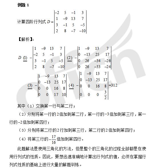 线性代数中,行列的计算前面我们讲解第一种方法是三角化,在三角化的过程中,我们使用的就是行列式的性质,那我们现在详细的介绍一下行列式的性质。例如下面这道例题: