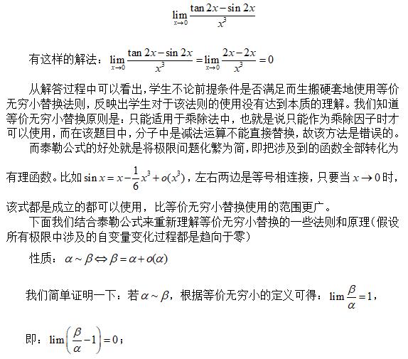 究其原因主要有两个:一是学生平时努力不够,对于常见的等价无穷小没有准确记忆并且对于此类求极限问题缺少练习;二是对于等价无穷小替换的实质还没有达到透彻的理解,使用的原则存在错记、混记的现象。比如练习时有这样的题目: