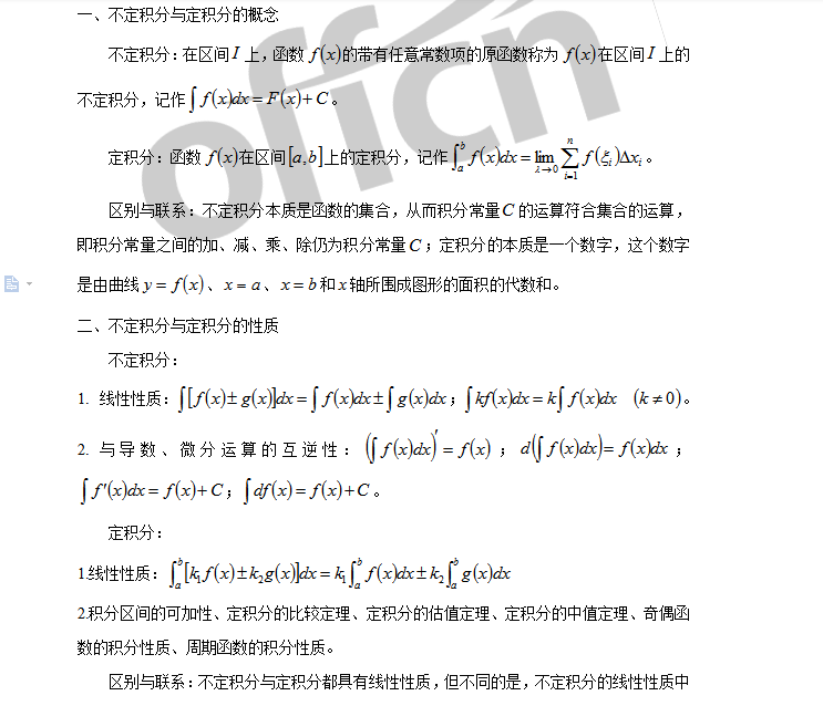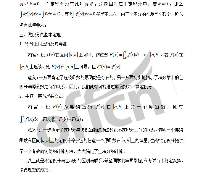 积分学是考研数学高等数学基本问题的最重要部分之一,考试大纲要求理解不定积分和定积分的概念、掌握不定积分和定积分的性质、掌握微积分的基本定理。因此,讨论不定积分与定积分的区别与联系,既有助于我们达到考试大纲的要求,又可以帮助我们系统的掌握积分学的基本知识进而拿下微积分的半壁江山—积分学。下面我们结合考试大纲的要求来讨论一下不定积分与定积分的区别与联系:
