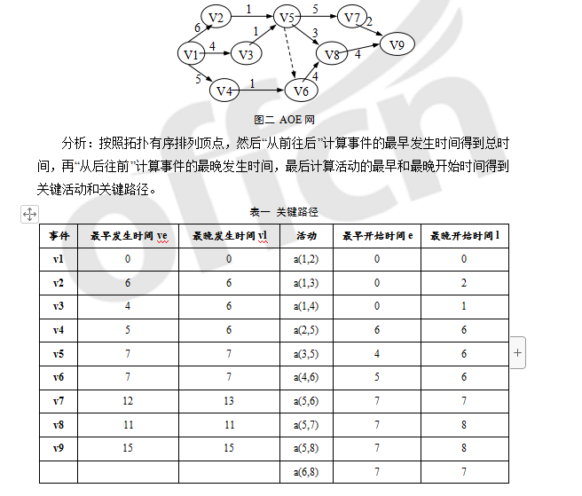 例:某工程的AOE网如图二,求(1)整个工程完工需要多长时间,(2)关键路径。说明:图中的虚线仅表示事件的先后关系,不代表具体活动。