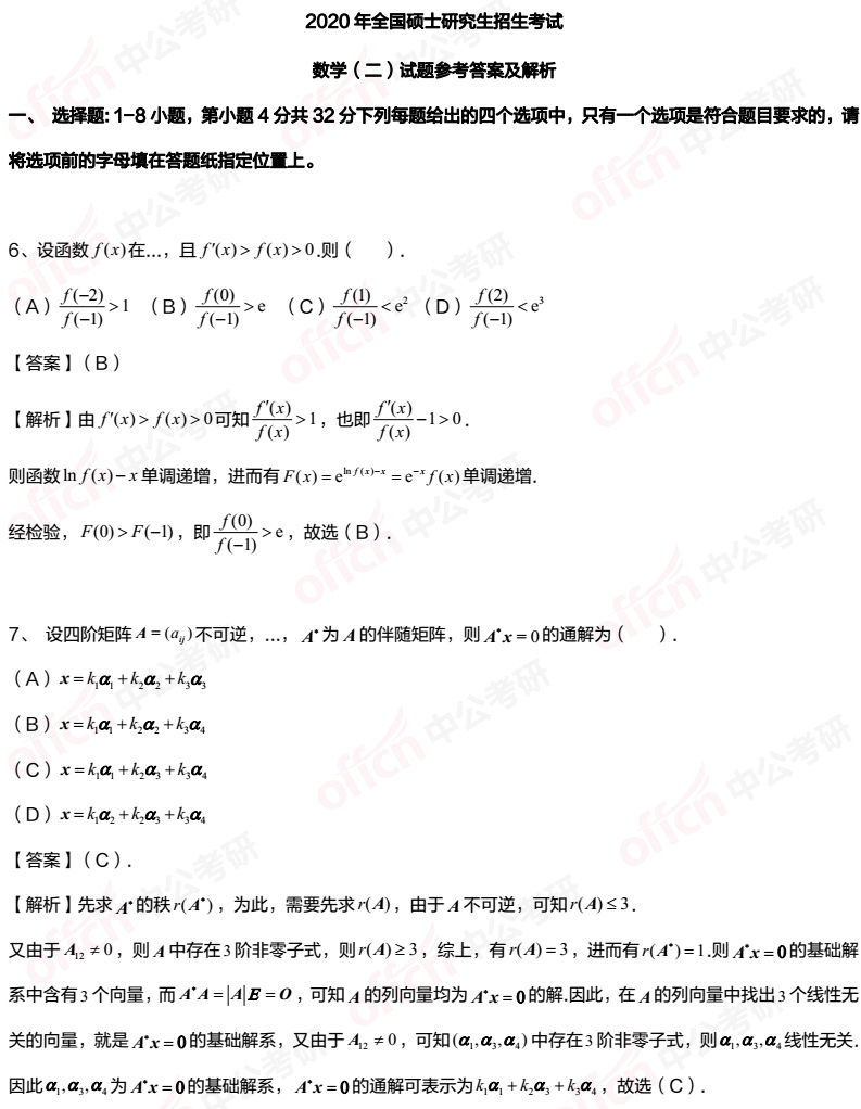 2020考研数学二选择题6-8试题及答案解析汇总(中公考研版)