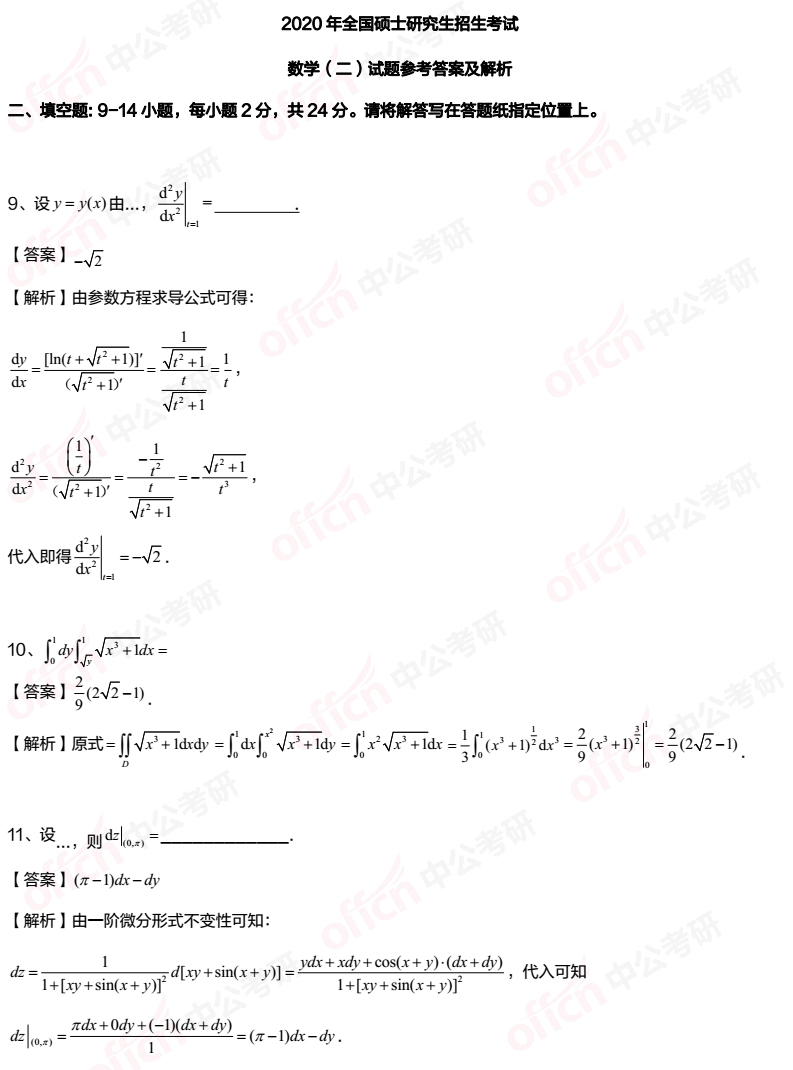 2020考研数学二填空题9-11试题及答案解析汇总(中公考研版)