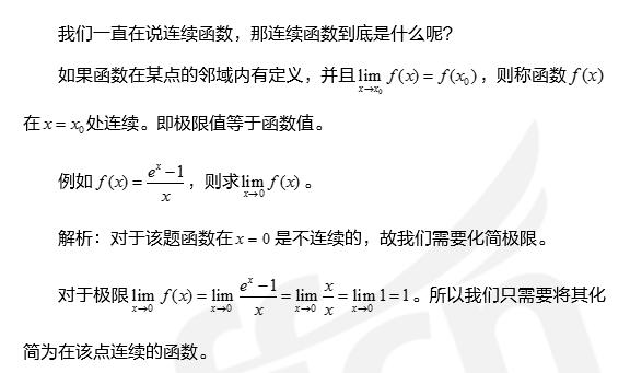 对于考研中的极限的计算,我们以后再碰到极限计算的化简时,能有一个方向。极限的计算,前面对于每一种的极限都有对应的方法,而这些方法,中间都涉及到化简,化简的目的是什么,就是化简为连续函数,直接将该点值直接代入。利用连续函数的极限值等于函数值。所以我们以后在计算极限时,尽量将函数化简为连续函数。