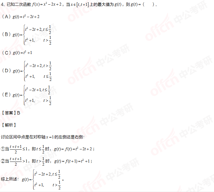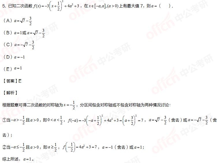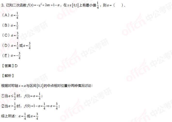 影响二次函数在闭区间上的最值主要有三个因素:抛物线的开口方向、对称轴和区间的位置。就考生而言,感到困难的主要是这两类问题:一是动函数定区间,二是定函数动区间。中公考研管综初数老师将以实例说明具体的求解方法,供大家参考。