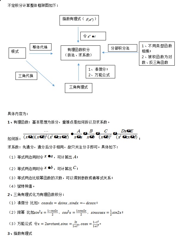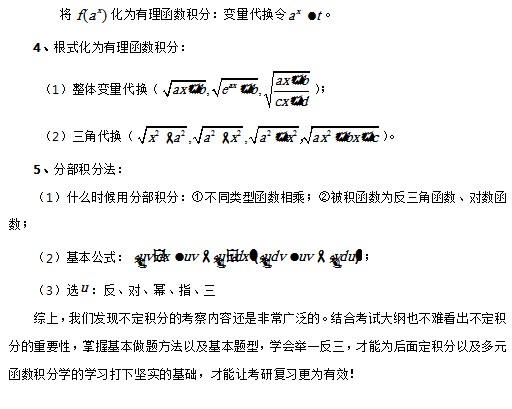 对于不定积分的计算,首先要明确不是所有的积分都能计算出来,其次要明确考试范围内要求我们会处理的积分类型有哪些。不定积分的计算题型以有理函数的积分作为基础,三角有理式、指数有理式、根式都是可化为有理函数的积分。在这些题型的计算过程中,积分公式、换元法、分部积分法会贯穿其中,尤其是分部积分法会和前面的题型进行结合考查。