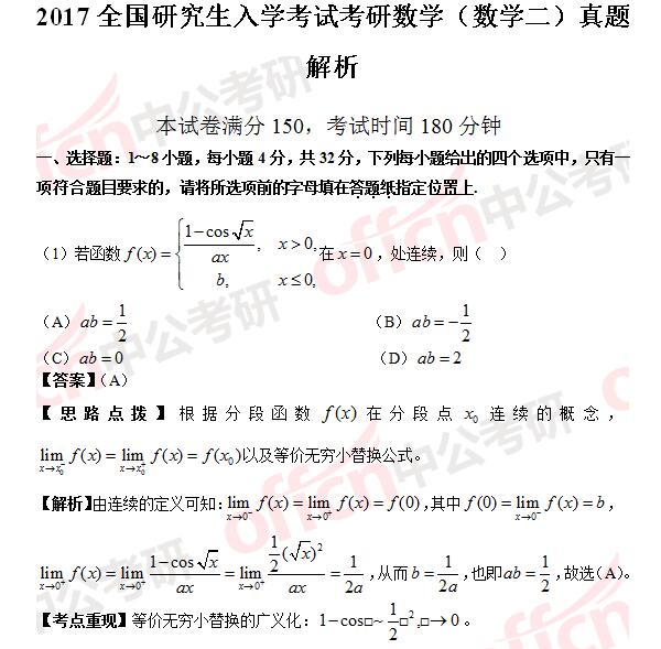 每年的国研究生统一招生初试考试试题(简称:考研试题)在大家考研过程中的重要程度不言而喻,即使在考研备基础备考阶段也要以历年考研试题为根本,下面是成都研招网数学辅导班老师整理发布2017年考研数学二答案及真题解析(完整版)供考生参考,预祝大家考个好成绩!