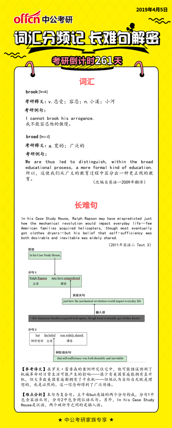 以上是四川中公考研小编为您整理的“2020考研英语:英语词汇分频记及考研英语长难句解密0405“,”预祝每位考生取得好成绩,更多考研常识相关内容尽在四川中公考研英语栏目,中公考研为广大学子推出乐学面授课、VIP一对一等系列备考课程,针对每一个科目要点进行深入的指导分析,欢迎各位考生了解咨询。同时,中公考研一直为大家推出考研直播课堂,足不出户就可以边听课边学习,为大家的考研梦想助力!